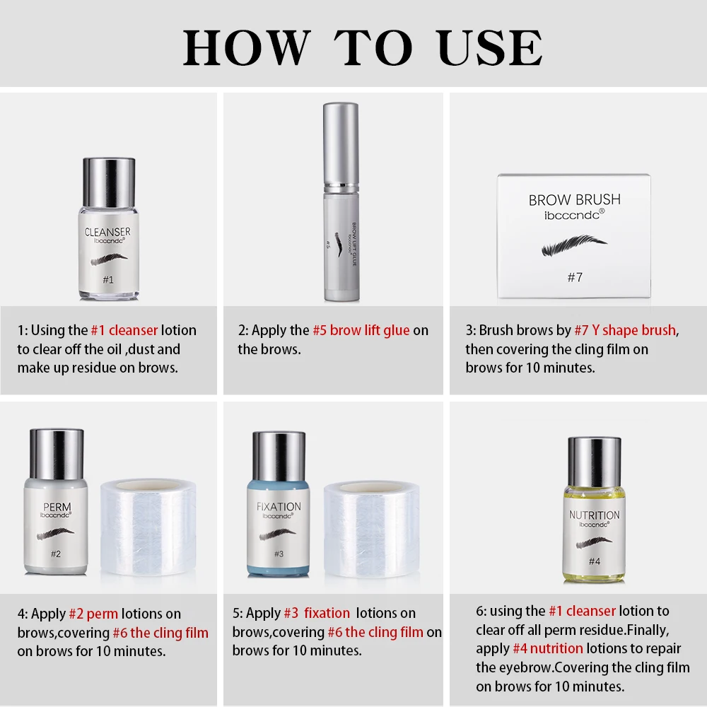 #1 cleanser lotion to clear off all perm residue. Finally, apply #4 nutrition lotions to repair the eyebrow. Covering the cling film on brows for 10 minutes.
